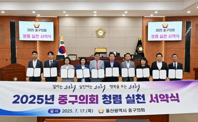 중구의회는 17일 본회의장에서 박경흠 의장을 비롯한 소속 의원 전원과 사무국 직원 등이 참석한 가운데 ‘2025년 청렴 실천 서약식’을 가졌다.