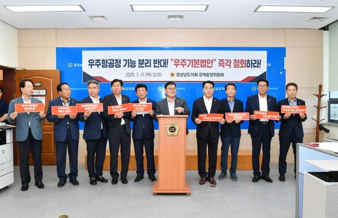 [경남도민뉴스=구인애 기자] 최근 국회에서 발의된 '우주기본법안'이 국가 우주정책 컨트롤타워인 우주항공청의 기능을 약화시키고, 중복기구를 신설하는 구조라는 비판이 제기되는 가운데, 경상남도의회 경제환경위원회 허동원 위원장을 비롯한 위원들이 기자회견을 열고 우주항공청 기능 분리 반대와 법안 철회를 강력히 촉구하고 나섰다.