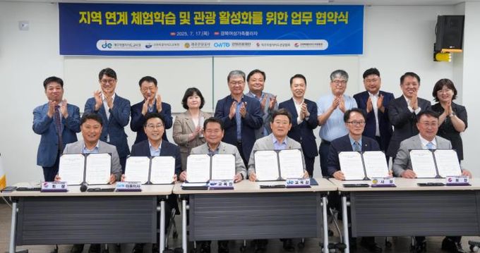[경남도민뉴스=류종길 기자] 강원특별자치도교육청과 제주특별자치도교육청, (재)강원관광재단, 강원특별자치도관광협회, 제주관광공사, 제주특별자치도관광협회는 17일 11시 경북여성가족플라자에서 지역 관광산업과 연계한 다양한 교육활동을 활성화하고, 문화·관광 체험 프로그램을 공동 개발·운영하기 위한 업무협약을 체결했다.