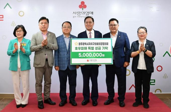 [경남도민뉴스=최현인 기자] 광주광역시 5개 자치구의회 의장들로 구성된 광주광역시자치구의회의장협의회가 24일 집중호우 피해 복구 성금 500만 원을 광주사회복지공동모금회에 기탁했다.