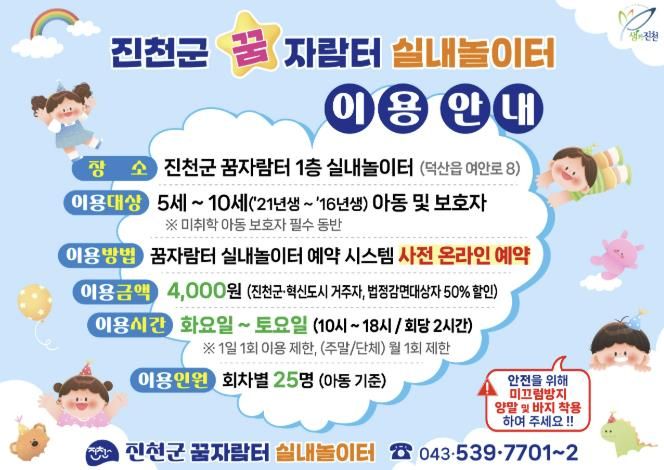 실내 놀이터 회차별 이용 시간은 2시간, 이용요금은 4,000원이며 진천군민과 혁신도시 거주자, 법정 감면대상자는 50% 할인이 적용된다.