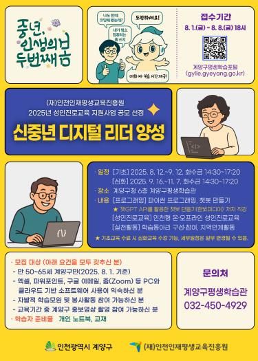 프로그램은 2025년 8월 12일부터 11월 7일까지, 계양구청 6층 평생학습관에서 3개월간 진행되며, 수강 신청은 8월 1일부터 8월 8일까지 계양구평생학습포털을 통해 할 수 있다.