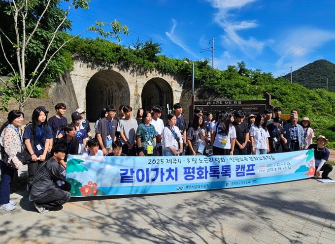 [경남도민뉴스=하형수 기자] 제주시교육지원청은 7월 28일부터 30일까지 2박 3일간 노근리평화공원 및 충북 영동 일원에서 제주시와 충북 영동지역 중학생 39명을 대상으로 ‘2025년 제주-노근리 같이가치 평화톡톡 캠프(영동)’를 운영했다.