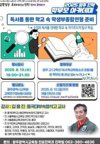 [경남도민뉴스=최현인 기자] 광주시교육청은 오는 13일 광주시교육청교육연구정보원 대강당에서 올해 4번째 ‘광주진학 학부모 아카데미’를 개최한다.