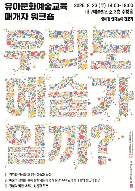 대구문화예술진흥원은 8월 23일, 대구예술발전소 수창홀에서 유아 문화예술교육 현장의 전문성과 예술성을 회복하기 위한 매개자 역량강화 워크숍 ‘우리도 예술가일까?’를 개최한다.