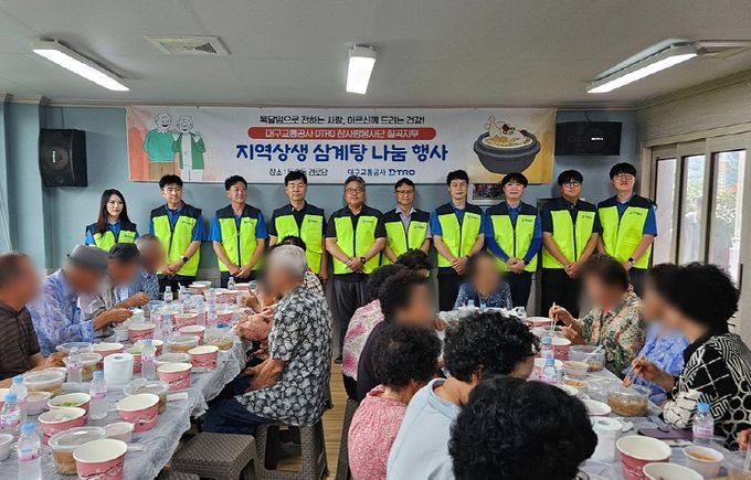 [경남도민뉴스=백상현 기자] 대구교통공사 참사랑봉사단 칠곡지부는 지난 7일 북구 국우동 행정복지센터와 함께 동호동 관내 어르신 60여 세대를 대상으로 ‘어르신 건강기원 삼계탕 나눔 행사’를 개최했다.