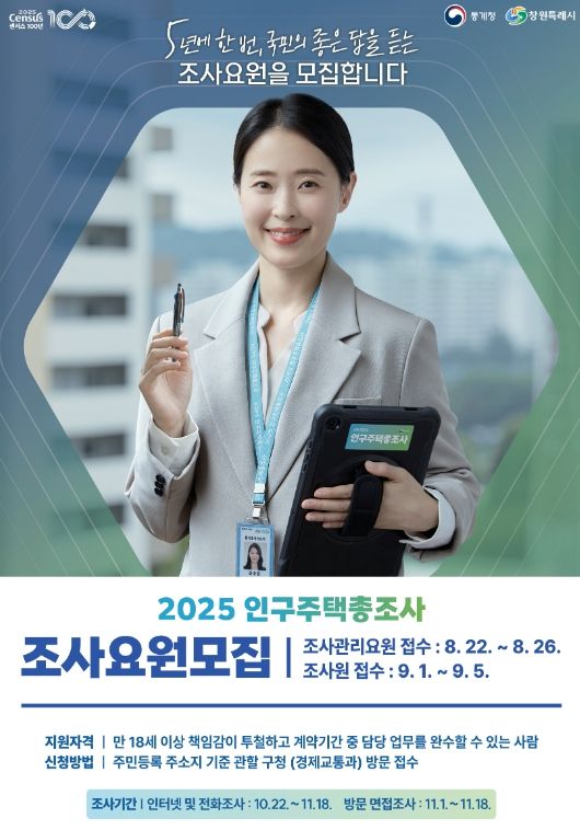 [경남도민뉴스=박민호 기자] 창원특례시는 오는 11월 전국적으로 시행되는 ‘2025 인구주택총조사’에서 현장조사를 담당할 조사요원 541명 모집공고를 8월 14일부터 9월 5일까지 진행한다.