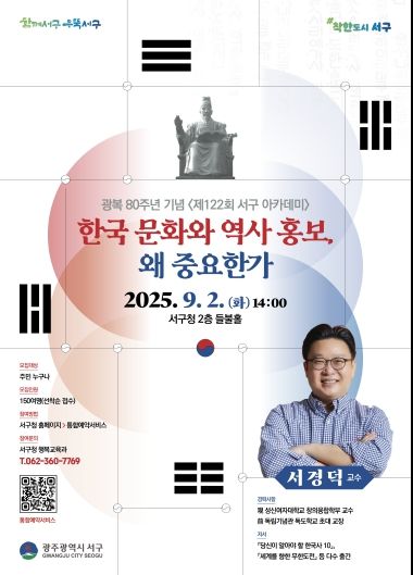 [경남도민뉴스=최현인 기자] 광주광역시 서구는 광복 80주년을 기념해 서경덕 성신여자대학교 교수 초청 제122회 서구 아카데미를 개최한다. 서구는 오는 9월 2일 오후 2시 서구청 들불홀에서 ‘한국 문화와 역사 홍보, 왜 중요한가’를 주제로 서 교수 강연을 개최한다고 밝혔다.