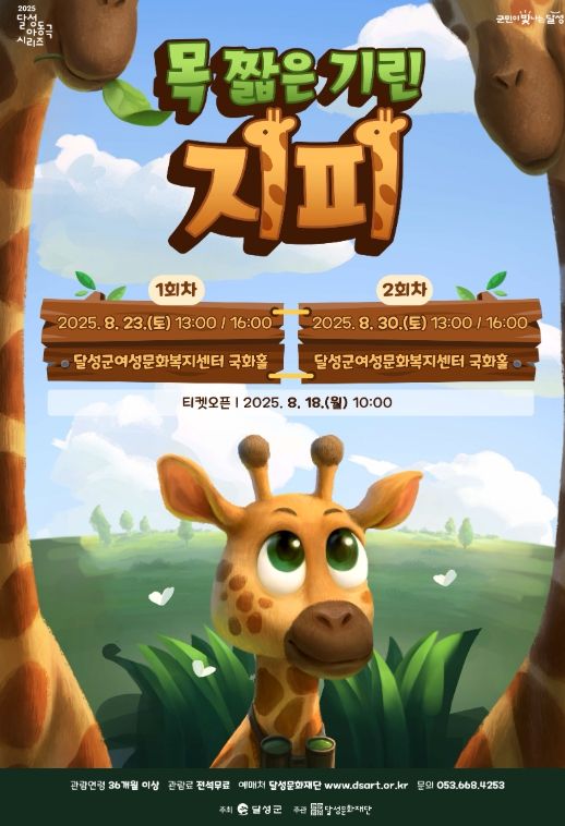 [경남도민뉴스=백상현 기자] (재)달성문화재단은 어린이들의 여름방학을 맞아 오는 23일과 30일 달성군여성문화복지센터 국화홀에서 온 가족이 함께 관람할 수 있는 뮤지컬 ‘목 짧은 기린 지피’를 개최한다고 밝혔다.