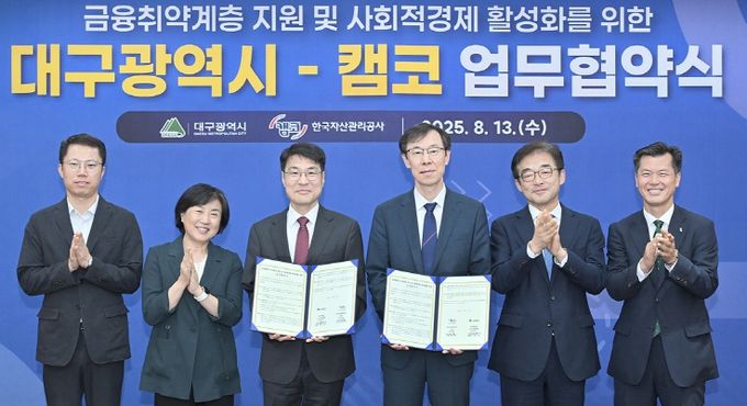 [경남도민뉴스=백상현 기자] 대구광역시는 8월 13일 오전 10시 30분, 동인청사 2층 상황실에서 한국자산관리공사(이하 ‘캠코’)와 함께 금융취약계층 지원 및 사회적경제 활성화를 위한 업무협약을 체결했다.