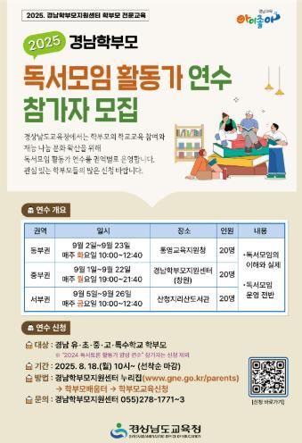 [경남도민뉴스=구인애 기자] 경상남도교육청은 학부모가 자발적으로 독서 문화를 확산하고 학교 교육 참여를 활성화할 수 있도록 ‘학부모 독서모임 활동가 양성 연수’를 9월 1일부터 26일까지 3개 권역에서 운영한다.