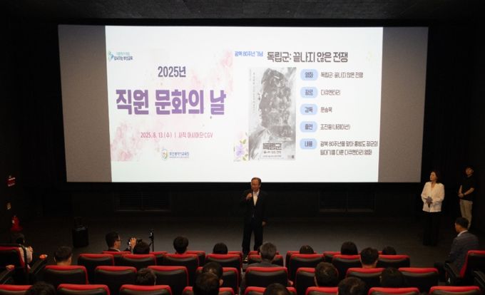 [경남도민뉴스=김채연 기자] 부산광역시교육청은 광복 80주년을 기념하고 ‘2025년 직원문화행사의 날’을 겸해 13일 오후 7시 CGV 아시아드에서 교육청 소속 직원 200여 명을 대상으로 영화 ‘독립군: 끝나지 않은 전쟁’을 단체관람했다.