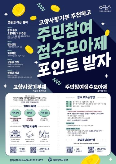 [경남도민뉴스=최현인 기자] 광주 동구는 관내 거주자와 사업장을 둔 주민을 대상으로 ‘고향사랑기부 주민참여점수모아제’를 홍보·운영하고 이를 통해 모금된 기부금을 활용해 지역에 활력을 불어넣고 주민 복리 증진에 기여하겠다고 밝혔다.