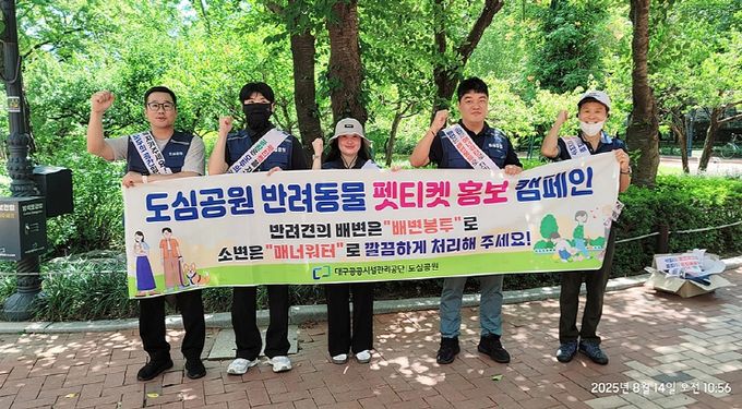 [경남도민뉴스=백상현 기자] 대구공공시설관리공단은 8월 14일 국채보상운동기념공원에서 반려견과 시민이 함께 쾌적하게 공원을 이용할 수 있도록 ‘펫티켓 캠페인’을 진행했다고 밝혔다.