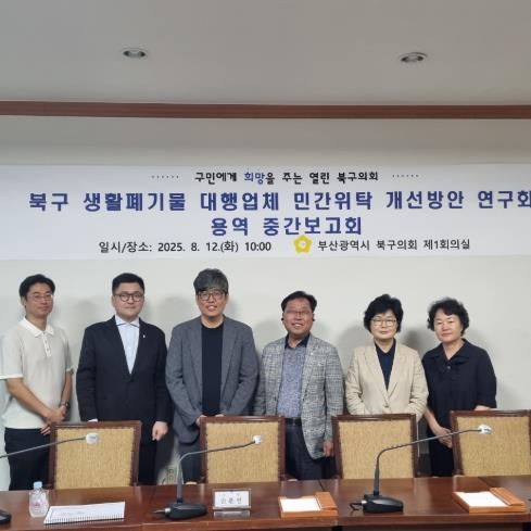 [경남도민뉴스=신석주 기자] 부산광역시 북구의회 의원연구단체 ‘북구 생활폐기물 대행업체 민간위탁 개선방안 연구회'가 8월 12일 오전 10시,‘북구 생활폐기물 민간위탁 개선방안 연구용역’중간보고회를 개최했다.