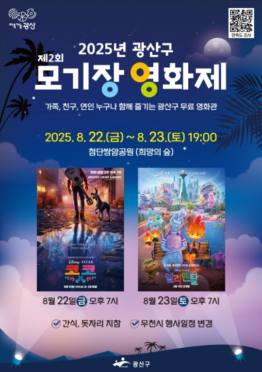 광산구 관계자는 “아쉽게 취소됐던 모기장 영화제를 다시 선보이게 돼 매우 기쁘다”며 “가족, 이웃, 친구들과 함께 시민들이 모기장 영화제에서 여름밤의 특별한 추억을 만들어가길 바란다”고 전했다.