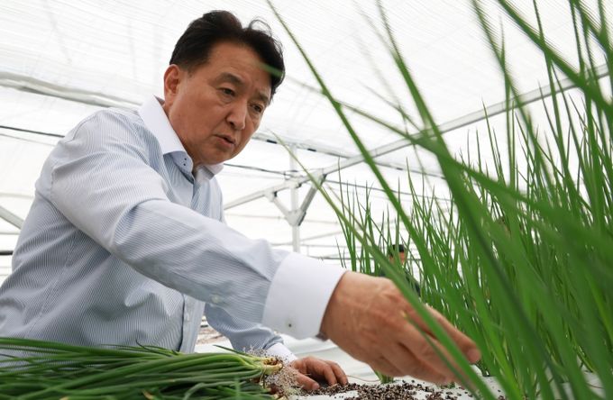 [경남도민뉴스=박만수 기자] 김영환 충북도지사는 19일 보은군 탄부면 임한리에 소재한 양념채소 스마트팜을 방문해 첫 수확 현장을 점검했다.