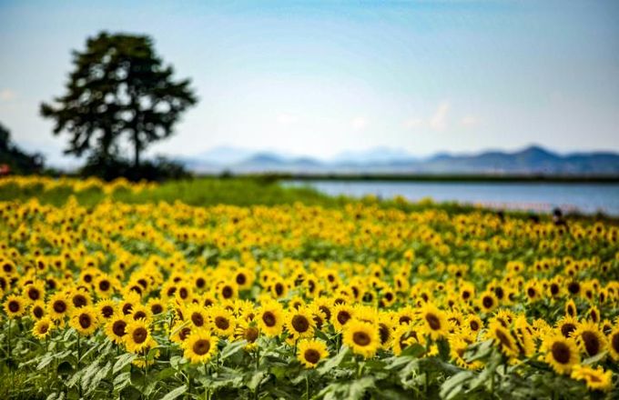 약 3만㎡ 규모의 공유수면에 해바라기가 황금빛 물결처럼 저수지를 따라 끝없이 펼쳐져 장관을 이룬다.