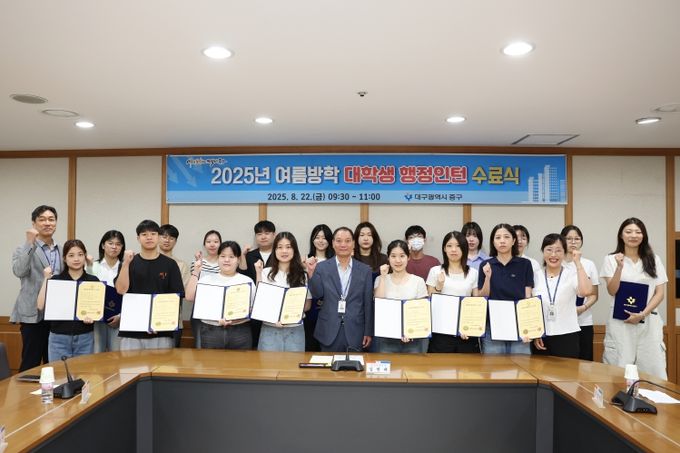 [경남도민뉴스=백상현 기자] 대구 중구는 지난 22일 구청 3층 상황실에서 ‘2025년 여름방학 대학생 행정인턴 수료식’을 개최했다.