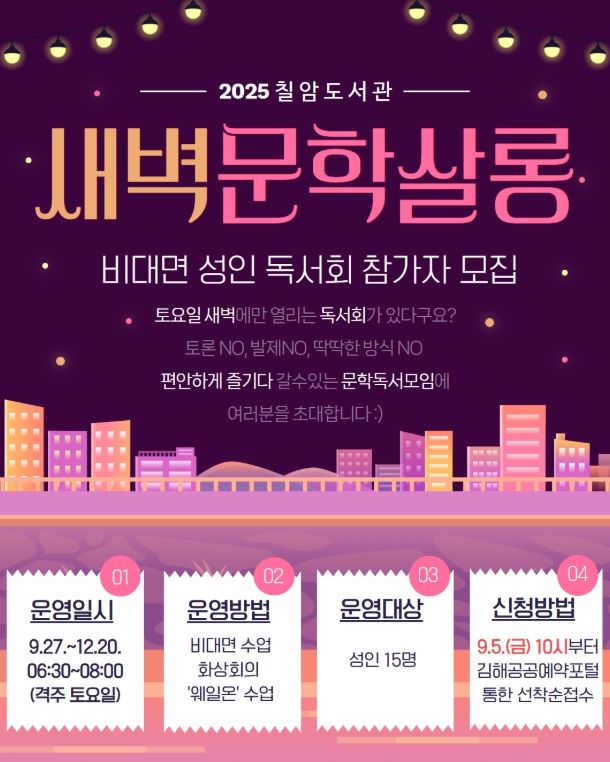 [경남도민뉴스=최미정 기자] 김해시 칠암도서관은 이른 아침 시간을 활용한 성인 독서회 ‘새벽문학살롱’ 참가자를 모집한다고 25일 밝혔다.