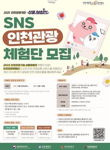 [경남도민뉴스=김용욱 기자] 인천광역시와 인천관광공사는 인천 관광기업의 판로확대와 마케팅 지원을 위한 ‘2025 인천관광기업 상품체험전(이하, 체험전)’시즌2 체험단 모집을 8월 26일부터 시작했다고 밝혔다.
