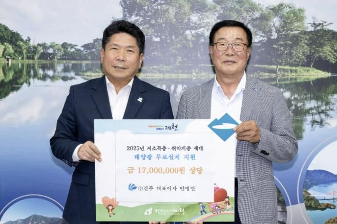 [경남도민뉴스=박만수 기자] 관내 태양광·전기 전문 시공업체인 ㈜건주가 지난 26일 제천시청을 방문해 관내 취약계층 3가구에 1,700만원 상당의 태양광 설비(3kw)설치 및 5년 유지보수 지원을 약속했다.