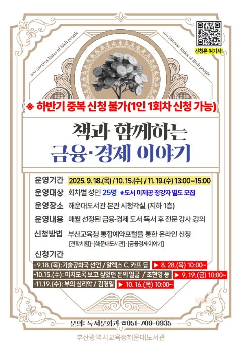노장석 해운대도서관장은 “이번 프로그램을 통해 지역주민들이 금융·경제 지식을 독서를 통해 폭넓게 이해하고, 이를 생활 속에서 실질적으로 적용해 건전한 소비 습관과 올바른 자산 관리 역량을 키우는 계기가 되기를 바란다”고 말했다.