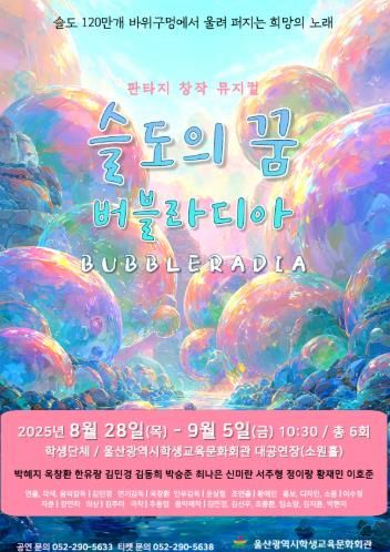 [경남도민뉴스=최재경 기자] 울산광역시학생교육문화회관은 오는 28일부터 9월 5일까지 대공연장 소원홀에서 유치원 원아와 초등학교 1~4학년 단체를 대상으로 창작 뮤지컬 ‘슬도의 꿈 버블라디아’를 공연한다.