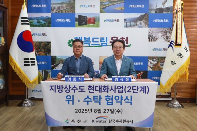 [경남도민뉴스=박만수 기자] 옥천군이 지난 27일 군청 군수실에서 한국수자원공사 금강유역본부와 함께 ‘지방상수도 현대화사업(2단계) 위수탁 협약’을 체결했다.