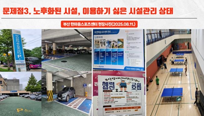 또한 박 의원은 시설 노후화 문제를 언급하며, 열악한 시설 환경이 장애인뿐만 아니라 일반 시민들도 이용을 꺼리게 만든다고 강조했다. 특히 주차장과 시설의 관리 상태가 매우 불량한데다, 일부 체육관 실내에서는 누수로 인해 안전사고 발생 우려가 있다고 지적했다.