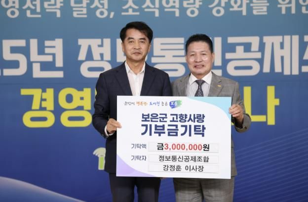 [경남도민뉴스=박만수 기자] 강정훈 정보통신공제조합 이사장은 지난 1일 속리산포레스트 연수원동 비전홀에서 열린 ‘2025 정보통신공제조합 경영발전 세미나’에서 보은군에 고향사랑기부금 300만원을 기탁했다.