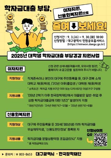 [경남도민뉴스=백상현 기자] 대구광역시는 지역 청년들이 경제적 부담을 덜고 학업과 취업에 전념할 수 있도록 ‘2025년 대학생 학자금대출 부담경감 지원사업’을 추진한다.