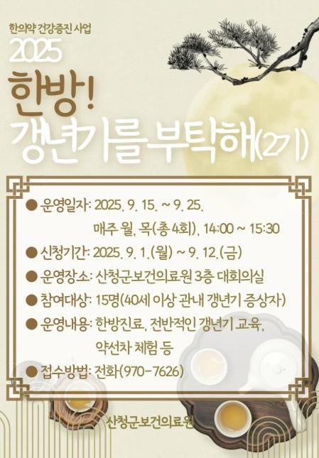 [경남도민뉴스=김태수 기자] 산청군은 ‘한방! 갱년기를 부탁해!(2기)’ 프로그램을 운영한다고 3일 밝혔다.