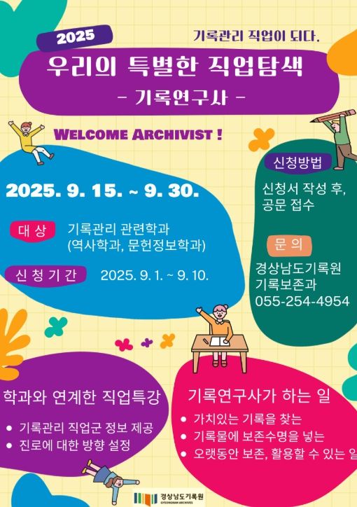 [경남도민뉴스=구인애 기자] 경상남도기록원은 오는 9월 15일부터 30일까지 영남권역 대학교 내 기록관리 직업군과 연계된 학과 대상으로 진로·교육 프로그램을 운영한다고 밝혔다.