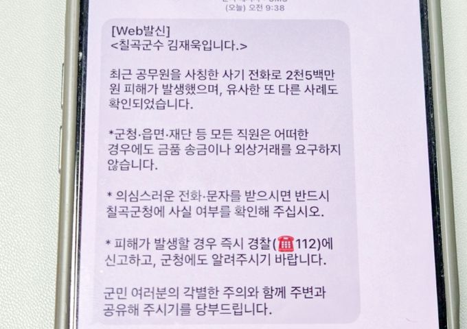 [경남도민뉴스=최민숙 기자] 칠곡군이 공무원 사칭 사기 피해 예방을 위해 지난 6월부터 지속적으로 안내와 홍보에 나선 가운데, 최근 실제 피해가 발생하자 긴급 대응에 돌입했다.