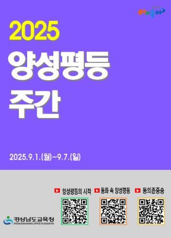 [경남도민뉴스=구인애 기자] 경상남도교육청은 양성평등 주간(9월 1일~7일)을 맞아 학생들의 양성평등 의식을 높이고, 학교 현장에서 성인지 감수성을 확산하기 위해 다양한 교육 행사를 운영한다.