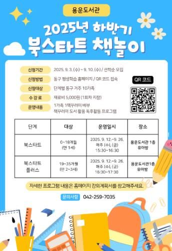 먼저, 용운도서관에서는 오는 12일부터 26일까지 관내 거주 10가구를 대상으로 ▲북스타트 단계(0~18개월) ▲북스타트 플러스 단계(19~35개월)를 무료 운영(재료비 별도)하며, 참가 신청은 동구 평생학습 누리집에서 선착순으로 진행된다.