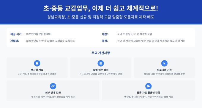 [경남도민뉴스=구인애 기자] 경상남도교육청은 오는 8일부터 도내 초·중등 교감의 업무 수행을 지원하기 위해 ‘2025학년도 하반기 초·중등 교감 업무 도움 자료’를 제작하여 배포한다.