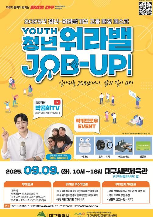 박윤희 대구광역시 청년여성교육국장은 “청년들이 대구에 정착하고 자신의 일과 삶을 균형 있게 설계할 수 있도록 앞으로도 일자리 매칭과 워라밸 문화 확산에 최선을 다하겠다”며, “이번 페스타가 청년들에게는 새로운 취업의 기회가 되고, 기업에는 우수한 지역인재를 확보하는 소중한 장이 되길 바란다”고 말했다.