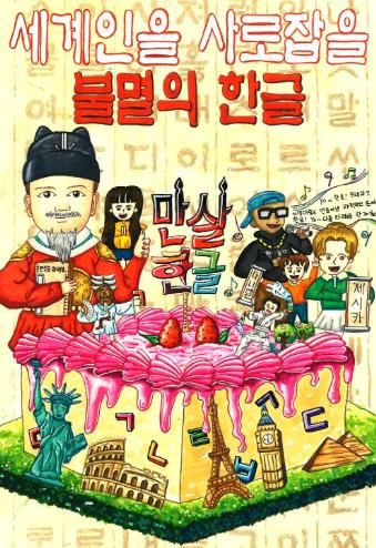 김서윤 학생은 작품 설명에서 한글 반포를 기념하는 케이크를 중심으로 세종대왕과 어린이, 세계 여러 나라 사람들이 한글의 생일을 축하하는 모습, 흑인 래퍼가 한글로 랩을 부르는 장면 등을 소개하며 한글의 세계적 확산과 불멸의 가치를 표현했다고 밝혔다.