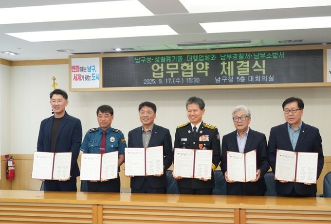 [경남도민뉴스=신석주 기자] 부산 남구는 지난 17일 구청 대회의실에서 남부경찰서, 남부소방서, 생활폐기물 대행업체와 업무협약(MOU)을 체결하고, 주민의 생활 현장에서 위험 요소를 조기 발견·대응하는 생활 속 안전망 구축 사업을 본격 추진한다고 밝혔다.