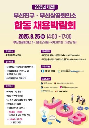 [경남도민뉴스=신석주 기자] 부산 부산진구는 오는 25일 오후 2시, 부산상공회의소 1·2층(대강당, 상의홀 등)에서 ‘2025년 제2회 부산진구·부산상공회의소 합동 채용박람회’를 개최한다고 밝혔다.
