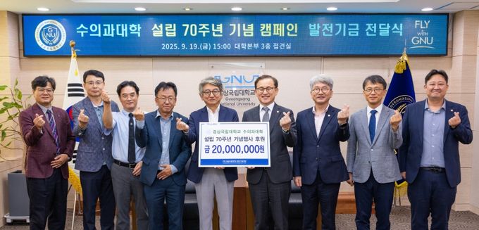 [경남도민뉴스=구인애 기자] 진주 동명고등학교를 졸업한 수의사들로 구성된 ‘동수회’(회장 김도경 동명대학교 반려동물대학 학장)가 경상국립대학교 수의과대학 설립 70주년 기념행사 후원을 위해 발전기금을 출연했다. 발전기금 전달식은 9월 19일 오후 3시 대학본부 3층 접견실에서 열렸다.