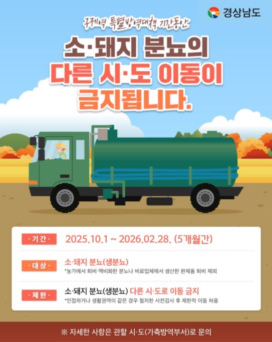 [경남도민뉴스=구인애 기자] 경상남도는 10월 1일부터 내년 2월 28일까지 구제역 확산을 막기 위해 소‧돼지 분뇨 운반차량의 권역 외 이동을 전면 금지한다고 밝혔다. 다만, 상황에 따라 기간은 단축되거나 연장될 수 있다.
