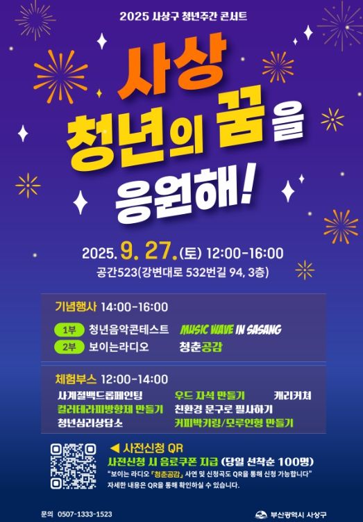 사상구 관계자는 “청년의 날을 맞아 개최되는 이번 청년 주간 행사가 청년들이 직접 주인공이 되는 자리이자 서로 소통하고 공감하며 청년의 꿈을 응원하는 축제가 되길 바란다”고 말했다.