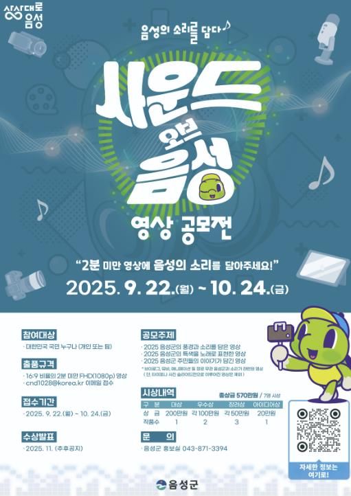 [경남도민뉴스=박만수 기자] 음성군은 오는 10월 24일까지 2025 사운드 오브 음성 영상 공모전을 개최한다고 밝혔다.
