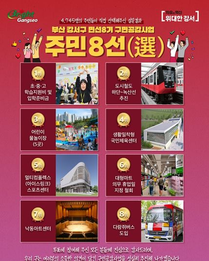 [경남도민뉴스=신석주 기자] 부산 강서구는 민선8기 3년간 추진한 주요 사업 가운데 주민이 직접 선정한 ‘주민 8선(選)’을 발표했다. 이번 조사는 지난 8월 14일부터 9월 13일까지 구 홈페이지(PC 또는 모바일)를 통한 온라인 설문 방식으로 진행됐으며, 총 4,745명이 참여해 큰 관심을 모았다.