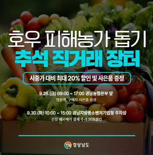 [경남도민뉴스=구인애 기자] 경상남도는 30일 경남지방중소벤처기업청 주차장에서 추석맞이 수해특별재난지역 농특산물 직거래장터를 개최한다고 밝혔다.