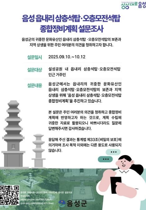 [경남도민뉴스=박만수 기자] 음성군은 읍내리 설성공원 일원에 위치한 ‘음성 읍내리 삼층석탑’ 및 ‘음성 읍내리 오층모전석탑’의 종합정비계획을 수립하는 과정에서 주민 의견 수렴을 위한 온라인 설문조사를 실시한다고 밝혔다.