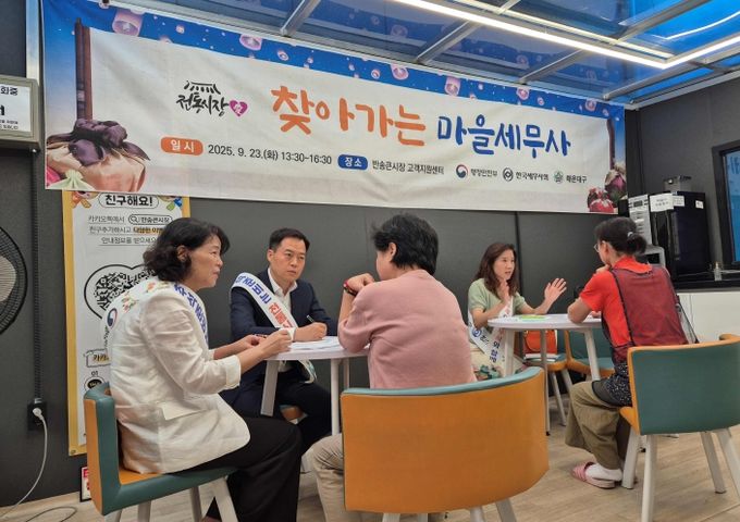 [경남도민뉴스=김채연 기자] 해운대구는 지난 23일, 추석을 맞아 반송큰시장에서 ‘찾아가는 마을세무사’ 행사를 열었다. 이번 행사는 지난해에 이어 두 번째로, 해운대구와 해운대지역세무사회가 공동 주최했다.